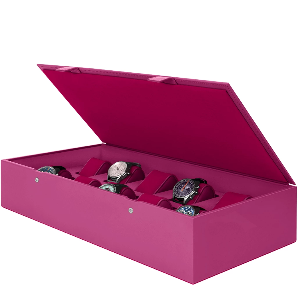 Highest quality leather, timely delivery, great packaging, fantastic quality control, great dye/coloring, fast communication, excellent stitching, smooth felt materials to prevent scratches or twirls on watches' case, great weight to exude luxuries feel, perfectly aligned lid, buttons which pops like old vintage cars' glove box