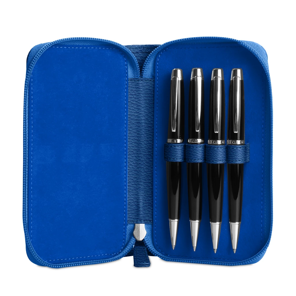 Pochette Zippée - 4 Stylos Bleu Roi  - Cuir Grainé