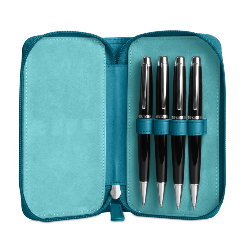 Étui 4 stylos Zippé en cuir véritable. Élégant étui pour 4 stylos Zippé. Patte intérieur pour fixation du stylo extensible. Convient donc parfaitement pour stylo fin, moyen et gros. Cet étui est idéal pour ranger ou transporter vos stylos. Il se glisse dans un sac ou dans une poche. Vendu sans stylo.