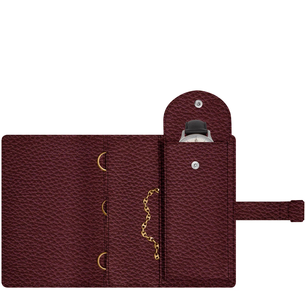 Pochette fitness pour montre et bijoux en cuir véritable. Pochette tout cuir intérieur et extérieur. Idéale pour ranger ses bijoux. Fermeture avec passant cuir. A droite un compartiment réservé à la montre. Une poche plate pour les bracelets ou colliers. Trois poches pour bagues.