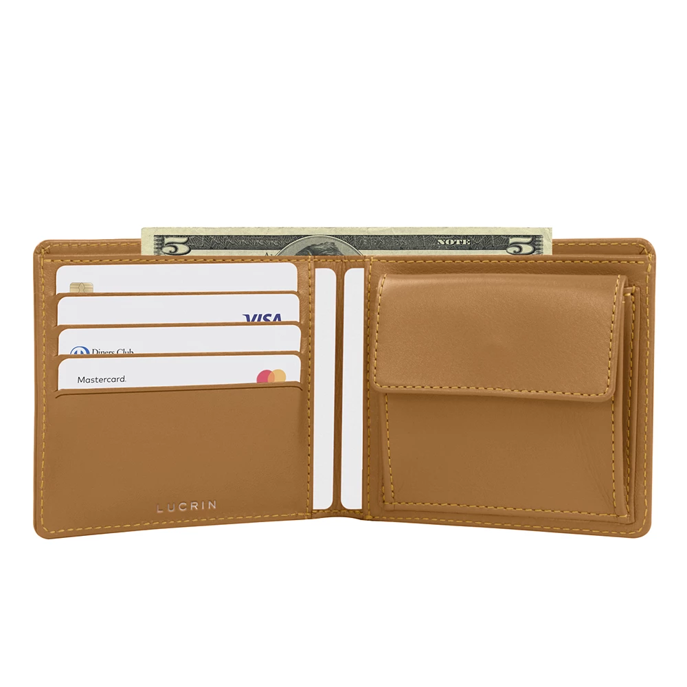 Si vous souhaitez tout avoir sur vous, choisissez ce porte-monnaie standard en cuir de luxe conçu par les meilleurs artisans maroquiniers de LUCRIN. Sur la gauche, vous avez 4 fentes pour cartes bancaires et en dessous une poche plate supplémentaire où vous pouvez par exemple insérer vos récépissés. Idem sur la droite de ce portemonnaie ; vous retrouvez la même poche plate, mais par-dessus, une autre avec bouton pression, idéale pour garder de la monnaie. Ce portefeuille en cuir comporte également une grande poche pour vos billets et petits papiers.